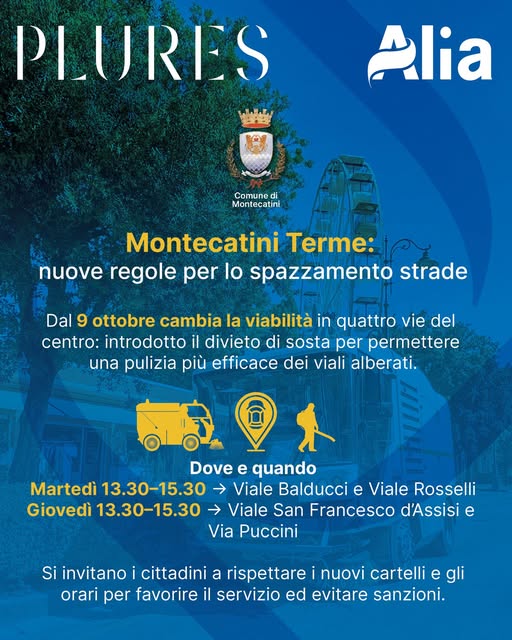 L'amministrazione comunale di Montecatini e Plures Alia hanno avviato l'introduzione del divieto di sosta in quattro strade del territorio, limitato agli orari di spazzamento, per agevolare il servizio di pulizia meccanizzata e combinata. Il provvedimento è stato studiato per rendere più efficiente lo spazzamento nei viali del centro città, dove la presenza delle alberature rende necessario un intervento più profondo e capillare per mantenere il decoro urbano.